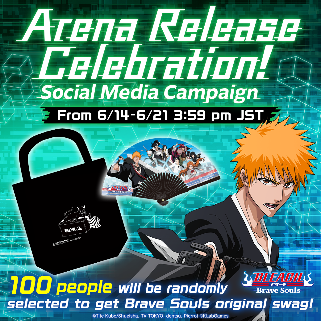 KLab Inc., a leader in online mobile games, announced that its hit 3D action game Bleach: Brave Souls, currently available on smartphones and PC, will release a brand new mode called Arena to the game where players worldwide can battle one another in real time starting today, Monday, June 14 after maintenance. In celebration, there will be a social media campaign where fans will have a chance to win original Brave Souls swag and various in-game campaigns!