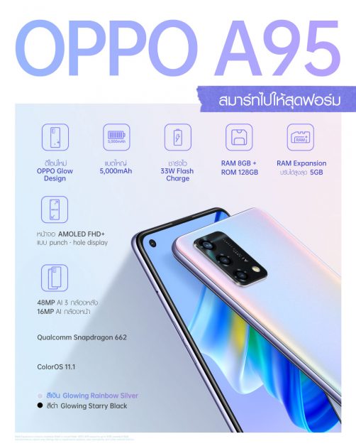 OPPO A95 สมาร์ทโฟนใหม่ล่าสุดจาก OPPO A Series มาภายใต้สโลแกน “สมาร์ทไปให้สุดฟอร์ม” ที่โดดเด่นด้วยประสิทธิภาพการใช้งานที่ลื่นไหลด้วย RAM 8GB, ROM 128GB และ RAM Expansion ที่สามารถเพิ่มได้ถึง 5GB พร้อมด้วย Qualcomm(R) SnapdragonTM 662 และ System Booster มอบความเร็วแรงขั้นสุดให้คุณสนุกได้ทุกการใช้งาน นอกจากการใช้งานที่เร็วแรงแล้ว ยังมาพร้อมชาร์จไว 33W Flash Charge และแบตเตอรี่ขนาดใหญ่จุใจ 5,000 mAh ให้คุณสนุกได้แบบไม่มีสะดุด รวมถึง AI 3 กล้องหลัง ความละเอียดสูงสุด 48MP ให้คุณทั้งถ่ายภาพและวิดีโอสนุกทุกช็อต พร้อมรองรับ Steady Video ในกล้องหลัง ให้คุณสามารถถ่ายวิดีโอได้นิ่งในทุกสถานการณ์
