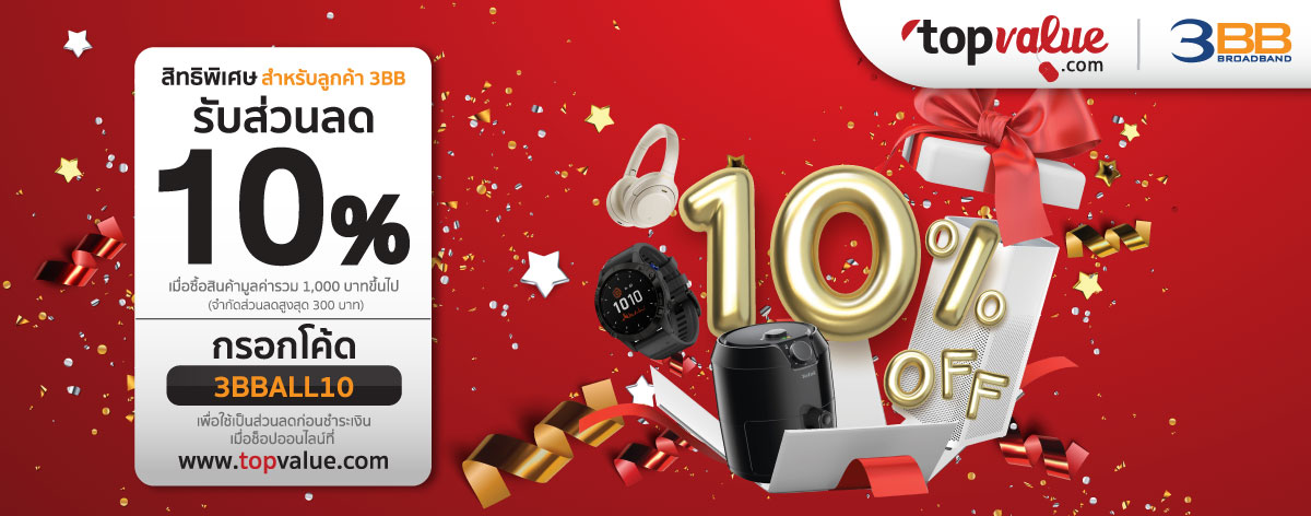 ช้อปได้แบบจุใจตลอด 24 ชั่วโมง ไม่ต้องออกจากบ้าน ไม่ต้องกลัวโควิด – 19 มีสินค้าให้เลือกสรรหลากหลายหมวดหมู่ ทั้งเครื่องใช้ไฟฟ้า คอมพิวเตอร์/ไอที โทรศัพท์มือถือ/แท็บเล็ต กล้อง เครื่องใช้สำนักงาน หรือสุขภาพ/ความงาม ลูกค้า 3BB ซื้อสินค้าในเว็บไซต์ Topvalue.com มูลค่า 1,000 บาทขึ้นไป รับส่วนลดทันที 10% (จำกัดส่วนลดสูงสุด 300 บาท / รายการสั่งซื้อ) เพียงใช้ Code: 3BBALL10 ก่อนยืนยันรายการสั่งซื้อและชำระเงิน ระยะเวลาโปรโมชั่นถึง 31 มีนาคม 2564 ดูรายละเอียดโปรโมชั่นและเงื่อนไขเพิ่มเติม ที่ Topvalue.com