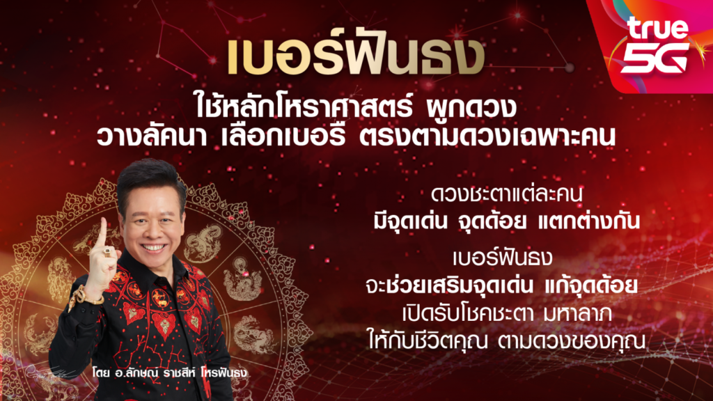 อาจารย์ลักษณ์ ราชสีห์ เปิดเผยถึงการร่วมมือกับทรูมูฟ เอชว่า “นี่เป็นปรากฏการณ์ครั้งแรกในแผ่นดินที่ผมได้นำหลักวิชาโหราศาสตร์ไทยจากประสบการณ์โหรอาชีพ 30 ปี ร่วมกับทรูเพื่อพัฒนาโปรแกรม ให้ลูกค้านำเดือน ปี เกิด ลงลึกถึงเวลาเกิด และสถานที่เกิด(จังหวัดเกิด ประเทศเกิด) มาคำนวณผูกดวง วางลัคนา เพื่อหาเบอร์ดีตรงดวงเฉพาะตัว แบบที่ยังไม่มีใครเคยทำมาก่อน และตามดวงชะตาของโลกที่ดาวมฤตยูโคจรมาทับราศีของดวงโลกในรอบ 84 ปี จะเกิดปรากฏการณ์การเปลี่ยนแปลงครั้งใหญ่ครั้งหนึ่ง โดยวิเคราะห์จาก ดาวมฤตยู หรือยูเรนัส โคจรเข้าสู่ราศีเมษ ทับดวงชะตาโลก ในรอบนี้เริ่มต้นในปี 2559และไปสิ้นสุดในปี 2565 ทุกรอบจักร จะเกิดสิ่งที่เลวร้ายใหญ่ๆในโลก เช่นสงครามโลก โรคระบาด ฯลฯ พร้อมไปกับการมีสิ่งที่ดีเกิดขึ้นในเรื่องใหญ่ๆในห้วงเวลาเดียวกัน เหมือนกับรอบที่ผ่านๆมา ซึ่งเหตุเภทภัยอันสำคัญของโลกกำลังหมดไป พร้อมกับดาวมฤตยูที่กำลังจะยกย้ายออก ในช่วงต้นปี 2565 เรื่องของเทคโนโลยีจึงน่าจะเป็นความหวังของมหาชนทั้งหลาย ในยุคสมัยแห่งการเปลี่ยนแปลงที่จะเข้าสู่จุดแห่งการเริ่มต้น นับตั้งแต่บัดนี้เป็นต้นไป “เบอร์ฟันธง” กับเทคโนโลยีอันล้ำสมัยในระบบ 5G จะเป็นส่วนหนึ่งที่ทางทรูมูฟ เอช ได้นำมาให้บริการกับประชาชน โดยเฉพาะเบอร์โทรศัพท์ที่ขึ้นต้นด้วยหมวดเลข 095 และ 096 ซึ่งเลขนำในเบอร์โทรศัพท์ 3 ตัวแรกมีความสำคัญ กล่าวคือ เลข 0 ในแผ่นดินไทย เป็นแผ่นดินศักดิ์สิทธิ์ เลข 9 คือ เลขดาวเกตุ เป็นเลขตัวแทนของสิ่งศักดิ์สิทธิ์ทั้งหลายในแผ่นดิน เลข 5 เป็นตัวเลขของประธานดาวฝ่ายศุภเคราะห์ ที่อำนวยโชค อำนวยชัย เลข 6 คือ ตัวเลขของดาวศุกร์ ซึ่งเป็นดาวประจำเมือง เป็นตัวเลขขุนคลังมหาสมบัติ ความสุขในทุกสถาน ดังนั้น หมวดตัวเลขในเบอร์โทรศัพท์ที่นำด้วย 095 และ 096 จึงเป็นตัวเลขประธานที่เป็นมงคลที่สุดจากนี้สืบไป นอกจากนี้ในเบอร์โทรศัพท์ยังมีหมายเลขอีก 7 หลัก ซึ่งหมายเลข 7 หลักนี้ ถ้าจะหาเลขให้เป็นมงคลแก่คนใดคนหนึ่ง ต้องเป็นตัวเลขที่เกิดจากการผูกดวงวางลัคนาตามหลักทางโหราศาสตร์ โดยต้องหาตำแหน่งเด่น เรือนที่ดีในดวงชะตาของบุคคลนั้น เพื่อมาวางเป็นตัวเลขในตำแหน่งต่าง ๆ ใน 7 หลักดังกล่าว การที่เราเตรียมพร้อมรับกับสิ่งดี ๆ ภายหลังการเปลี่ยนแปลง โดยเฉพาะในเรื่องชีวิตการงาน การเงิน อาชีพ การค้าขาย ความรัก ครอบครัวและโชคลาภ ทรูมูฟ เอช ได้เห็นความสำคัญของมงคลที่จะสร้างขวัญและกำลังใจให้กับมหาชน จึงเกิด “สุดยอดเบอร์ฟันธง” ที่ทรูมูฟเอช ตั้งใจมอบให้กับคนไทยทุกคน เพื่อเป็นม