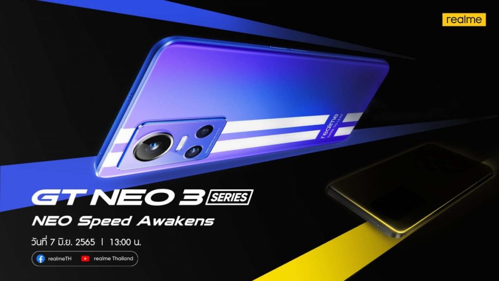 realme (เรียลมี) แบรนด์สมาร์ตโฟนเพื่อคนรุ่นใหม่ที่เติบโตเร็วที่สุดโลก ประกาศเปิดตัว realme GT NEO 3 Series ในประเทศไทยอย่างเป็นทางการในวันที่ 7 มิถุนายน 2565 มาด้วยกัน 2 รุ่น ได้แก่ realme GT NEO 3 หนึ่งในสมาร์ตโฟนรุ่นแรก ๆ ที่ขับเคลื่อนด้วยขุมพลัง MediaTek Dimensity 8100 ประสิทธิภาพสุดล้ำเทียบชั้นรุ่นเรือธง พัฒนาบนสถาปัตยกรรม 5 นาโนเมตรแบบ 8 แกนประมวลผล ผสานการทำงานที่เร็วแรงสะใจในทุกแอปพลิเคชัน มาพร้อมกับเทคโนโลยี SuperDart Charge 80W ชาร์จเร็วทันใจกว่าเดิม โดดเด่นด้วยดีไซน์ที่ได้รับแรงบันดาลใจจากสนามแข่ง สะท้อนความโฉบเฉี่ยวแบบ Racing Stripe Design