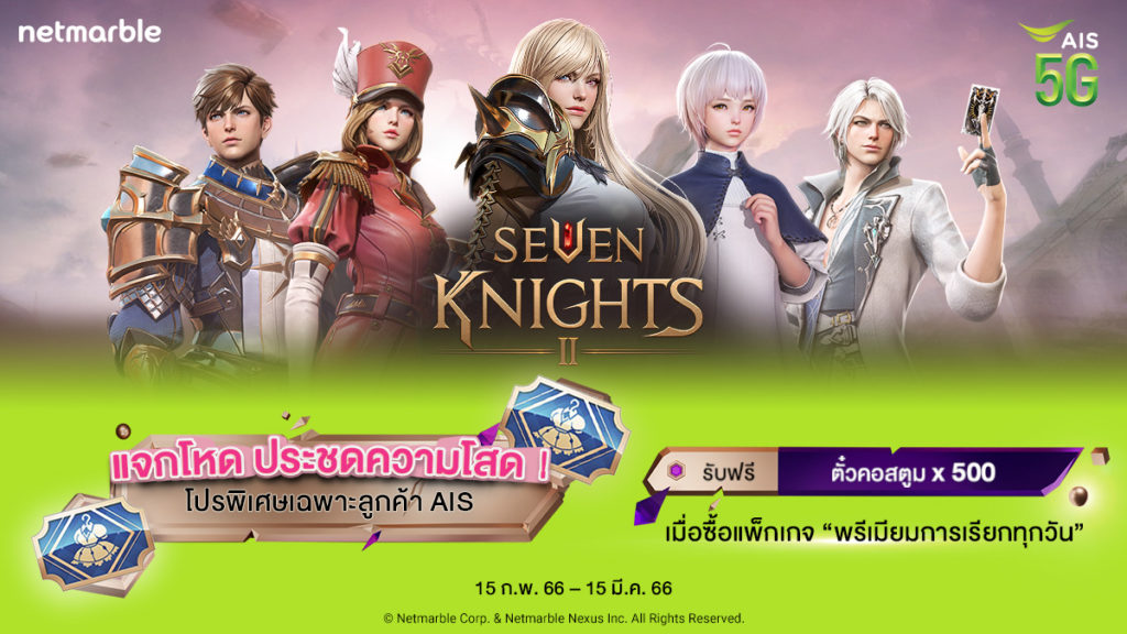 วันนี้ เน็ตมาร์เบิ้ลคอร์ปอเรชั่น ผู้พัฒนาและให้บริการเกมมือถือคุณภาพสูงชั้นนำร่วมมือกับเอไอเอส แจกโหด ประชดความโสด! มอบโปรสุดพิเศษเฉพาะลูกค้า AIS เท่านั้น สำหรับเกมมือถือแนวสวมบทบาทอัศวินสุดยิ่งใหญ่อย่างเกม เซเว่นไนท์ 2 เพียงซื้อแพ็กเกจ “พรีเมียมการเรียกทุกวัน” มูลค่า 179.- บาท ก็รับไปเลย ตั๋วคอสตูม x 500 ฟรี! อย่ารอช้า เพียง 5,000 สิทธิ์แรกเท่านั้น ตั้งแต่วันนี้ – 15 มีนาคม 66 นี้เท่านั้น หรือจนกว่าสิทธิ์จะหมด ห้ามพลาด!!
