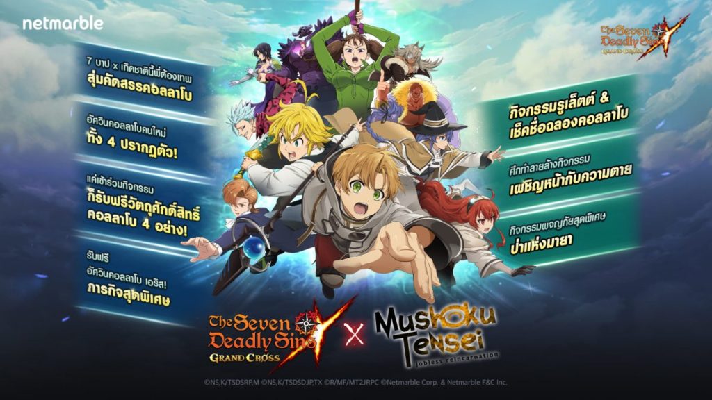 เน็ตมาร์เบิ้ล ผู้พัฒนาและให้บริการเกมมือถือคุณภาพสูงชั้นนำ ได้ปล่อยอัปเดตเกมใหม่สำหรับ The Seven Deadly Sins: Grand Cross โดยอัปเดตครั้งนี้ภูมิใจนำเสนอซีรีส์มังงะและอนิเมะยอดนิยมอย่าง เกิดชาตินี้พี่ต้องเทพ (Mushoku Tensei) ซึ่งคอลลาโบสุดพิเศษจากอัปเดตในครั้งนี้มีตัวละครอัศวินใหม่, กิจกรรมสุดสเปเชียล, ของรางวัล, และอื่น ๆ อีกมากมาย ที่เหล่าแฟน ๆ ไม่ควรพลาด !