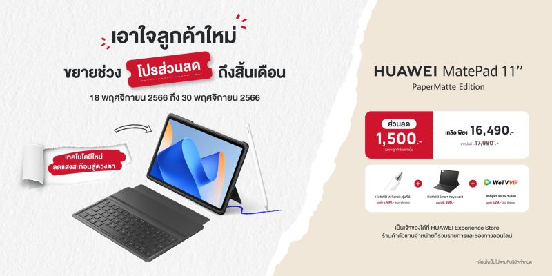หัวเว่ย คอนซูมเมอร์ บิสสิเนส กรุ๊ป (ประเทศไทย) เอาใจลูกค้าใหม่ขยายช่วงโปรส่วนลดตามคำเรียกร้อง ตั้งแต่วันที่ 18 พฤศจิกายน 2566 ถึง 30 พฤศจิกายน 2566 HUAWEI MatePad 11″ PaperMatte รับส่วนลดพิเศษ 1,500 บาท เหลือเพียง 16,490 บาท จากราคาปกติ 17,990 บาท พร้อมรับฟรี ปากกา HUAWEI-M Pencil รุ่นที่ 2 มูลค่า 4,490 บาท (แถมมาในกล่อง) เคสคีย์บอร์ด HUAWEI Smart Keyboard มูลค่า 4,990 บาท และ WeTV VIP 3 เดือน มูลค่า 429 บาท (300 สิทธิ์แรก) เป็นเจ้าของได้ที่ HUAWEI Experience Store ร้านค้าตัวแทนจำหน่ายที่ร่วมรายการและช่องทางออนไลน์ Lazada และ Shopee