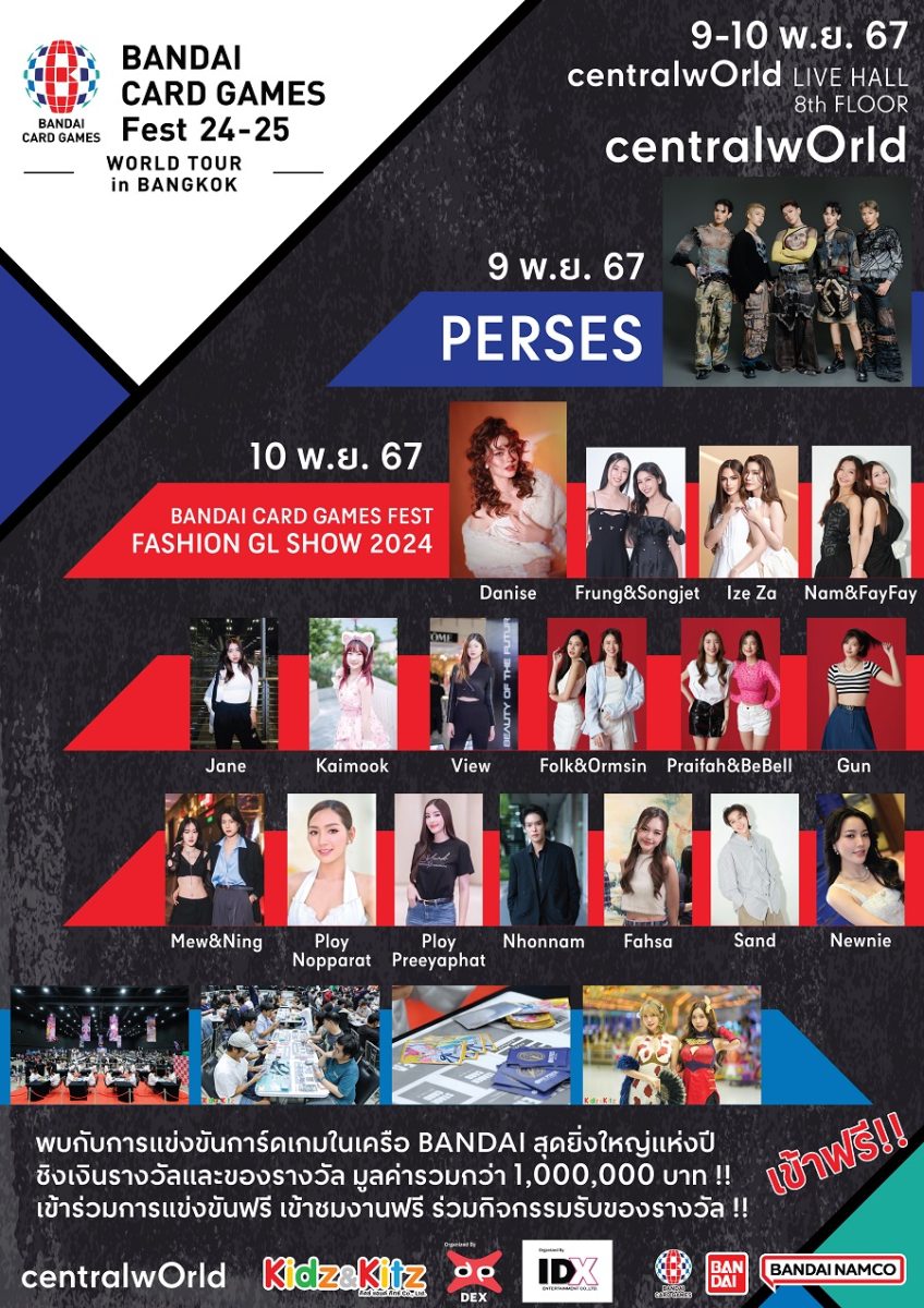 แฟนๆ “BANDAI CARD GAMES” เตรียมตัวให้พร้อม แล้วมาระเบิดความมันส์กันอีกครั้ง กับอีเวนต์สุดยิ่งใหญ่แห่งปี “BANDAI CARD GAMES Fest 24-25 World Tour in Bangkok” ที่งานนี้ บริษัท คิดซ์ แอนด์ คิทซ์ จำกัด ผู้แทนจำหน่ายและผลิต Card Game ลิขสิทธิ์แท้จากญี่ปุ่น ร่วมกับ บริษัท บันได จำกัด (ประเทศญี่ปุ่น) เจ้าของลิขสิทธิ์การ์ดเกมยอดฮิตแบรนด์ “BANDAI CARD GAMES” จัดขึ้น เพื่อให้เหล่าผู้เล่นการ์ดเกมและแฟนๆ ได้ร่วมแข่งขันและสนุกสนานกับกิจกรรม พร้อมชมมินิคอนเสิร์ตจากศิลปิน T-POP วง PERSES (เพอร์เซส) และแฟชั่นโชว์ Bandai Card Game Fest Fashion GL Show ครั้งแรก จากเหล่านักแสดงเกิร์ลเลิฟ กว่า 24 ชีวิต โดยดีไซน์เนอร์ชื่อดัง คุณกุ้ง – ศรุดา นิ่มพิทักษ์พงศ์ ห้ามพลาด!!! วันที่ 9-10 พ.ย.นี้ ที่ CentralwOrld Live Hall ชั้น 8 CentralWorld