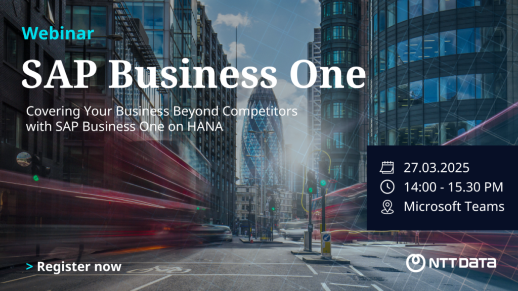 NTT DATA Business Solutions (Thailand) Ltd. ขอเรียนเชิญผู้บริหาร, ผู้จัดการสารสนเทศ, ผู้จัดการบัญชี และผู้ที่สนใจระบบ SAP Business One ทุกท่านพบกับงานสัมมนาออนไลน์ในหัวข้อ “Covering Your Business Beyond Competitors with SAP Business One on HANA” ซึ่งงานนี้จะจัดขึ้นในวันพฤหัสบดีที่ 27 มีนาคม 2568 เวลา 14.00 – 15.30 น. ผ่าน Microsoft Teams