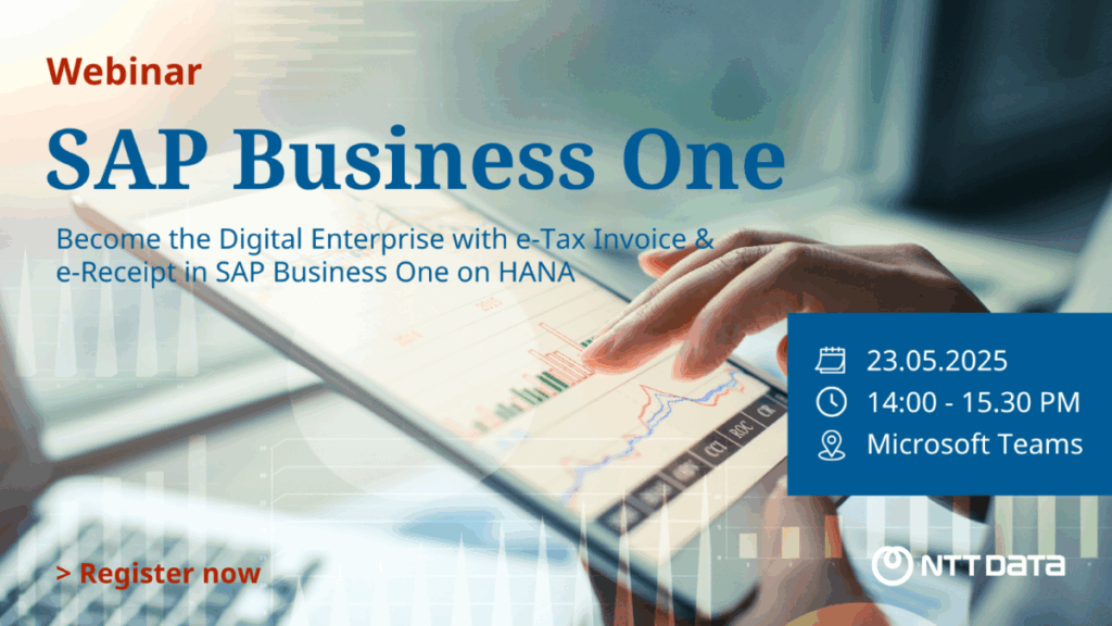 NTT DATA Business Solutions (Thailand) Ltd. ขอเรียนเชิญผู้บริหาร, ผู้จัดการสารสนเทศ, ผู้จัดการบัญชี และผู้ที่สนใจระบบ ERP ทุกท่านพบกับงานสัมมนาออนไลน์ในหัวข้อ “Become the Digital Enterprise with e-Tax Invoice & e-Receipt in SAP Business One on HANA” ซึ่งงานนี้จะจัดขึ้นในศุกร์ที่ 23 พฤษภาคม 2568 เวลา 14.00 – 15.30 น. ผ่าน Microsoft Teams