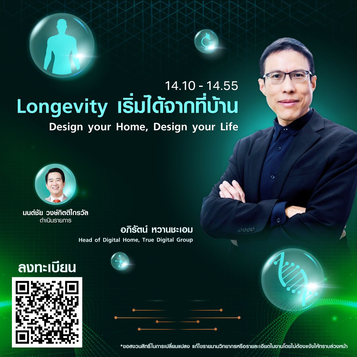 ภายในงานจะได้พบกับสปีกเกอร์ชื่อดังระดับประเทศ ที่จะมาให้มุมมองและแบ่งปันประสบการณ์เพื่อคุณภาพชีวิตที่ยืนยาวในทุกด้าน ได้แก่: