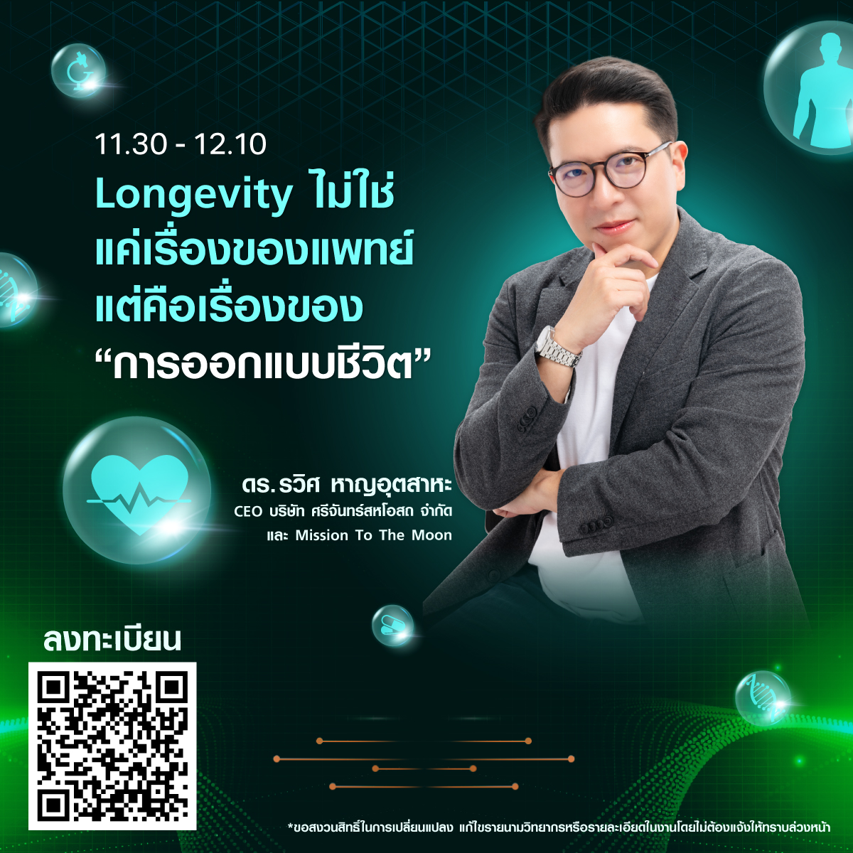 • ดร.รวิศ หาญอุตสาหะ CEO บริษัท ศรีจันทร์สหโอสถ จำกัด และ Mission to the moon กับหัวข้อ Longevity Mindset อยู่อย่างมีความหมาย