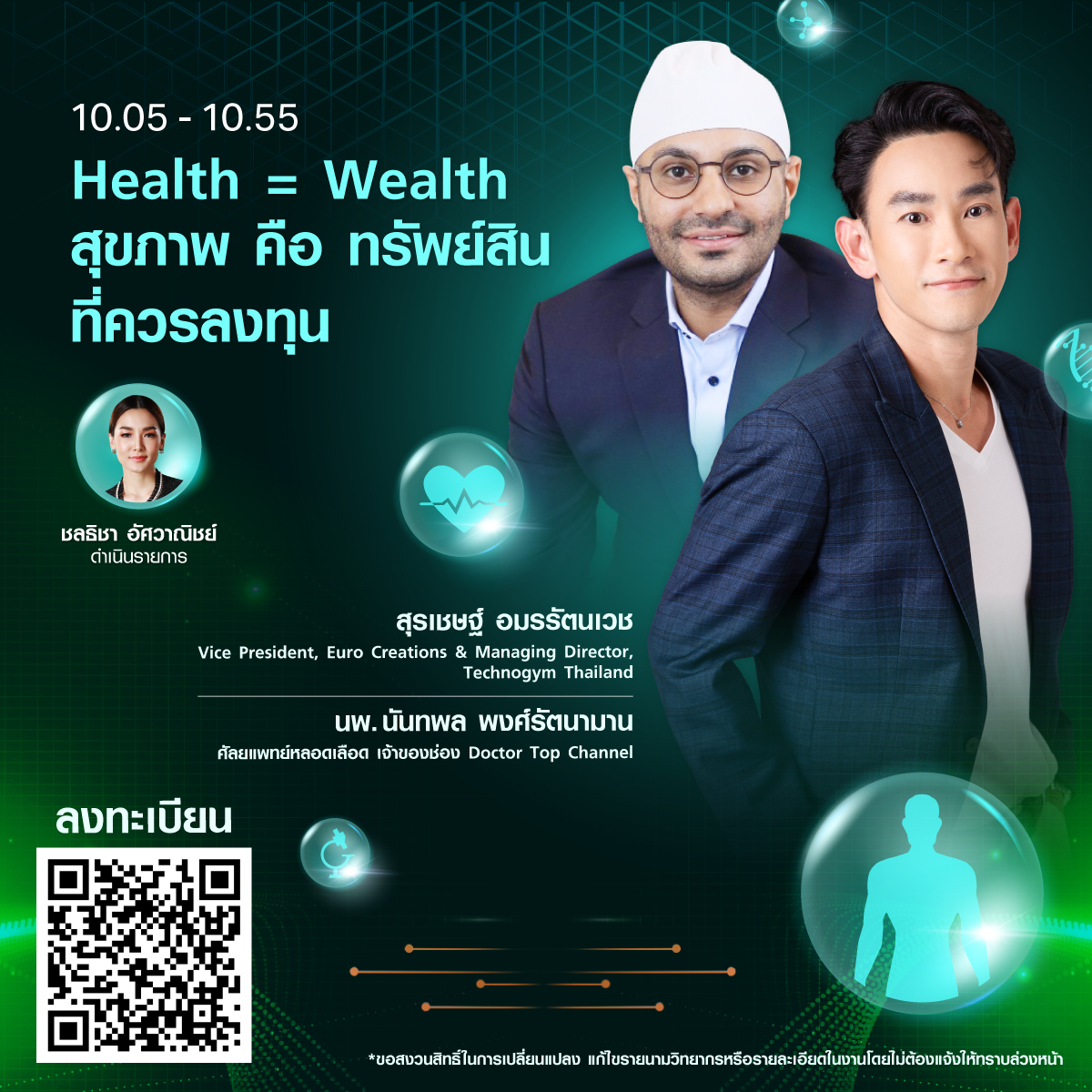 • หมอท๊อป – นพ.นันทพล พงศ์รัตนามาน ศัลยแพทย์หลอดเลือด เจ้าของช่อง Doctor Top Channel และ คุณสุรเชษฐ์ อมรรัตนเวช Vice President, Euro Creations & Managing Director, Technogym Thailand กับหัวข้อ Design your Health and Wellbeing through technology