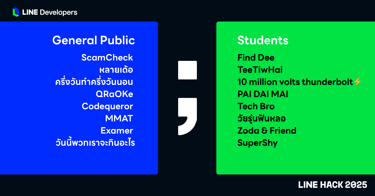 ทั้งนี้ หากแยกตามกลุ่ม พบว่า หัวข้อยอดนิยมสำหรับกลุ่มนักพัฒนาทั่วไปคือ “โซลูชันเพื่อธุรกิจ SME” ตามมาด้วย บันเทิง & ไลฟ์สไตล์ และ การศึกษา ตามลำดับ ในขณะที่ระดับนักศึกษา “การศึกษา” ยังคงเป็นหัวข้อยอดนิยม รองลงมาคือ บันเทิง & ไลฟ์สไตล์ และ สุขภาพ & Well-being เทรนด์การเลือกหัวข้อเหล่านี้ แสดงให้เห็นถึงมุมมองใหม่ของนักพัฒนาไทย ที่ต้องการใช้ทักษะความรู้เพื่อช่วยแก้ปัญหาจริง และสร้างผลลัพธ์เชิงสังคมในหลากหลายมิติ โดยจากผู้สมัครทั้งหมด LINE ได้คัดเลือก 16 ทีมสุดท้าย แบ่งเป็นระดับนักพัฒนาทั่วไป 8 ทีม และระดับนักศึกษา 8 ทีม เพื่อเข้าร่วมการแข่งขันในวันที่ 29-30 พฤศจิกายน 2025