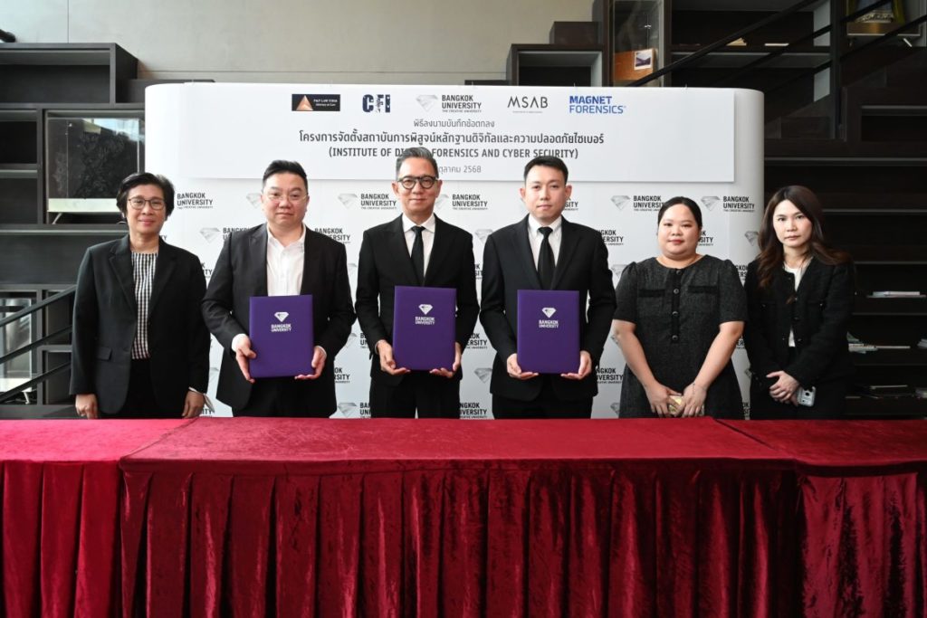 มหาวิทยาลัยกรุงเทพ ลงนามบันทึกข้อตกลงความร่วมมือ (MoU) จัดตั้ง “สถาบันการพิสูจน์หลักฐานดิจิทัลและความปลอดภัยไซเบอร์” (Institute of Digital Forensics and Cyber Security) ร่วมกับ P&P Law Firm และ Cyber Forensic and Investigation (CFI) ร่วมด้วยพันธมิตรเทคโนโลยีชั้นนำระดับโลก ได้แก่ Magnet Forensics (USA) และ MSAB (Sweden) ในการสนับสนุนโปรแกรม AXIOM และ XRY เพื่อพัฒนาศักยภาพบุคลากรด้านนิติวิทยาศาสตร์ดิจิทัลและความมั่นคงปลอดภัยไซเบอร์ของประเทศไทย