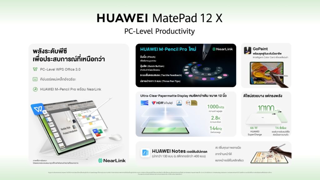 อย่าพลาดเป็นเจ้าของ HUAWEI MatePad 12X (2026) ได้โดยเมื่อพรีออเดอร์ระหว่างวันที่ 25 ธันวาคม 2568 ถึง 4 มกราคม 2569 พร้อมรับสิทธิประโยชน์สุดคุ้มด้วยของสมนาคุณมูลค่ารวมถึง 15,660 บาท ได้แก่ Huawei Smart Magnetic Keyboard มูลค่า 6,990 บาท HUAWEI M-Pencil Pro มูลค่า 5,490 บาท 66W SuperCharge Power Adapter มูลค่า 1,690 บาท HUAWEI Bluetooth Mouse มูลค่า 1,490 บาท พร้อมการติดตั้งแอปพลิเคชันฟรีได้แก่ PC-level WPS Office 3.0 มูลค่า 3,990 บาท HUAWEI Notes มูลค่า 1,990 และ GoPaint มูลค่า 1,990 บาท พร้อมส่วนลดเก่าแลกใหม่ 2,000 บาท