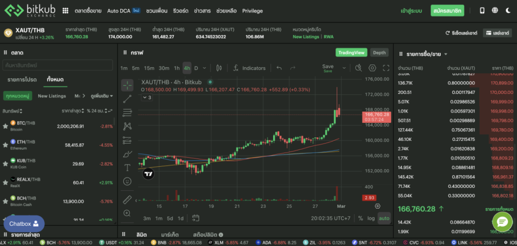สรุปภาวะตลาด Tether Gold (XAUT)ล่าสุดจากการตรวจสอบข้อมูลบนกระดานเทรด Bitkub Exchange ณ เวลา 20:02 น. ประจำวันที่ 28 กุมภาพันธ์ 2569 พบว่าราคาสินทรัพย์ทองคำดิจิทัลมีการเคลื่อนไหวที่น่าสนใจ โดยราคาปัจจุบันแตะ 166,760.28 บาท สถิติในรอบ 24 ชั่วโมง: ราคาปรับตัวเพิ่มขึ้นอย่างต่อเนื่องถึง +3.26% โดยมีช่วงการแกว่งตัวของราคาระหว่างจุดสูงสุดที่ 174,000.00 บาท และจุดต่ำสุดที่ 161,482.27 บาท มูลค่าการซื้อขาย: มีปริมาณการซื้อขายรวม (24 ชม.) หมุนเวียนสูงถึง 106.86 ล้านบาท สะท้อนถึงความเชื่อมั่นของนักลงทุนที่หลั่งไหลเข้าสู่สินทรัพย์ประเภททองคำดิจิทัลในช่วงภาวะวิกฤต สามารถเช็กราคา Tether Gold (XAUT) แบบ Real-Time ได้ที่ https://www.bitkub.com/th/market/XAUT_THB