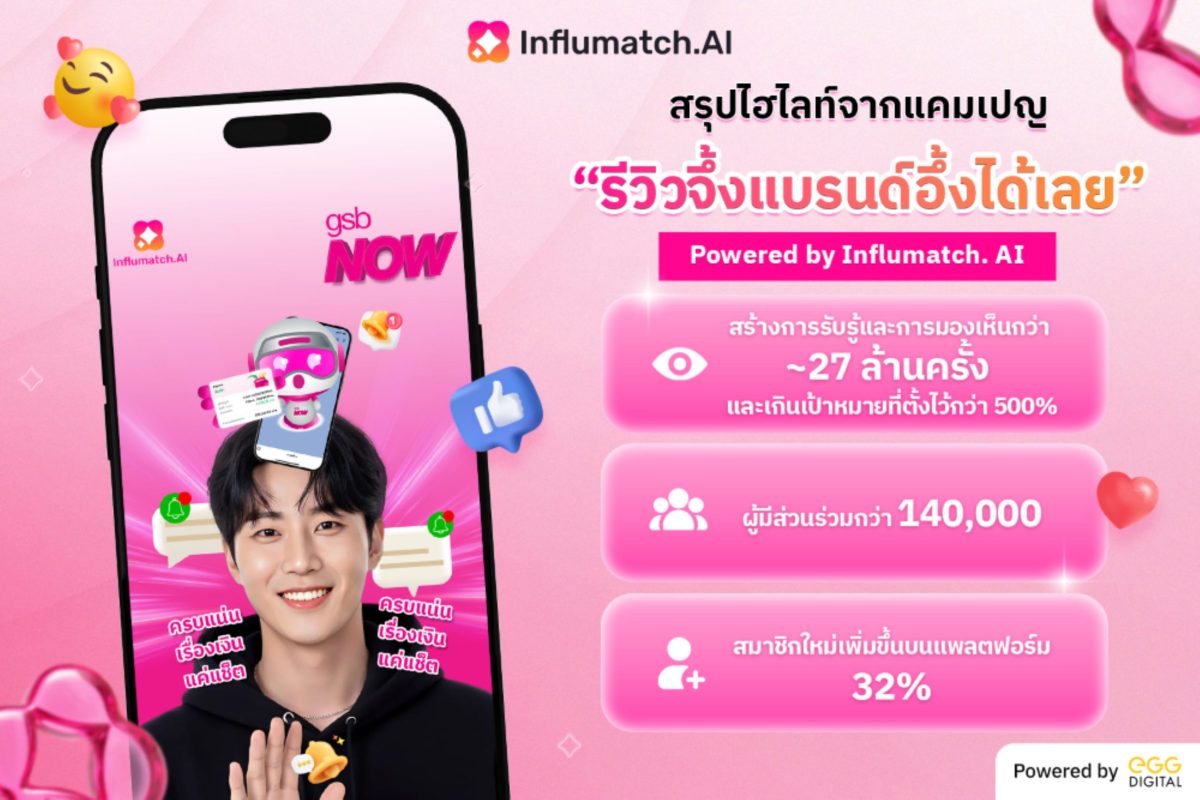 เอ้ก ดิจิทัล (EGG Digital) สร้างปรากฏการณ์ใหม่ให้วงการ Influencer Marketing เปิดเวทีเดบิวต์ครีเอเตอร์หน้าใหม่ ผ่านแคมเปญ “รีวิวจึ้งแบรนด์อึ้งได้เลย presented by Influmatch.AI” ผนึกกำลัง TikTok และแบรนด์ชั้นนำจาก 5 อุตสาหกรรม ได้แก่ ธนาคารออมสิน, อายิโนะโมะโต๊ะ, โอเรียนทอล พริ้นเซส, ซีพีเอฟ และทรูบิสิเนส เปิดสนามจริงให้ครีเอเตอร์หน้าใหม่ได้พิสูจน์ศักยภาพในการสร้างสรรค์คอนเทนต์รีวิวผ่านฟิลเตอร์ เอฟเฟกต์บน TikTok เพื่อชิงรางวัลและโอกาสต่อยอดสู่การร่วมงานกับแบรนด์ดังผ่านแพลตฟอร์ม Influmatch.AI (อินฟลูแมตช์ เอไอ) ล่าสุด ประกาศความสำเร็จตลอดแคมเปญมียอดรับชมคอนเทนต์รวมกว่า 27 ล้านครั้ง และสร้างการเข้าถึงมากกว่า 1.8 ล้านครั้ง ตอกย้ำบทบาทของ Influmatch.AI ในฐานะแพลตฟอร์มที่เชื่อมแบรนด์กับครีเอเตอร์ที่ “ใช่” ได้อย่างมีประสิทธิภาพ
